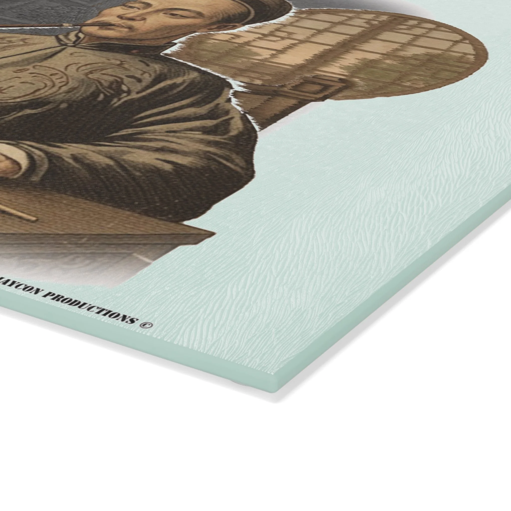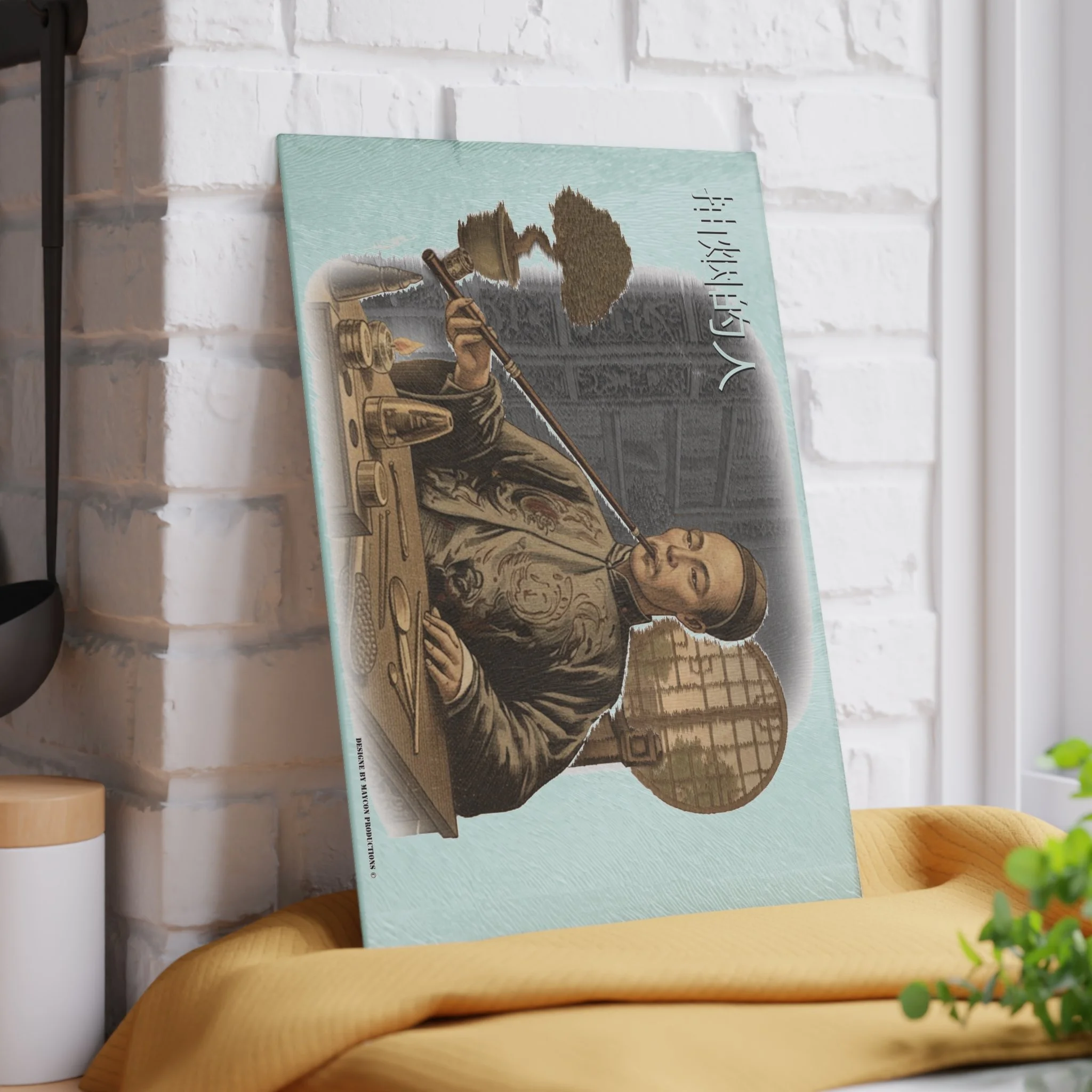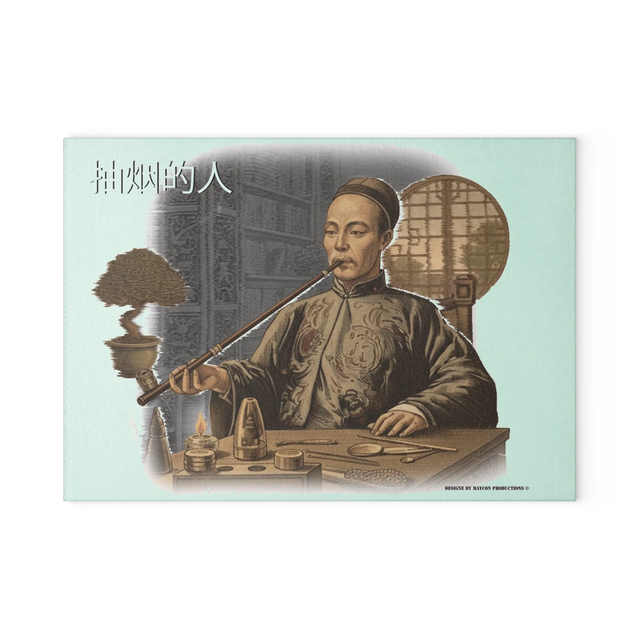 The Dampfmeister Brett is a tempered glass cutting board that brings a sense of calm and culture to everyday cooking. Its surface features a vintage-style illustration of a contemplative figure seated in a softly lit study, smoking a long pipe beside a bonsai and antique tools — an image that invites a quiet pause before the work begins.
